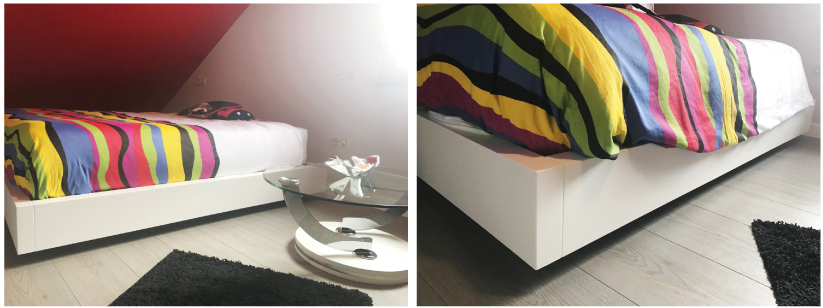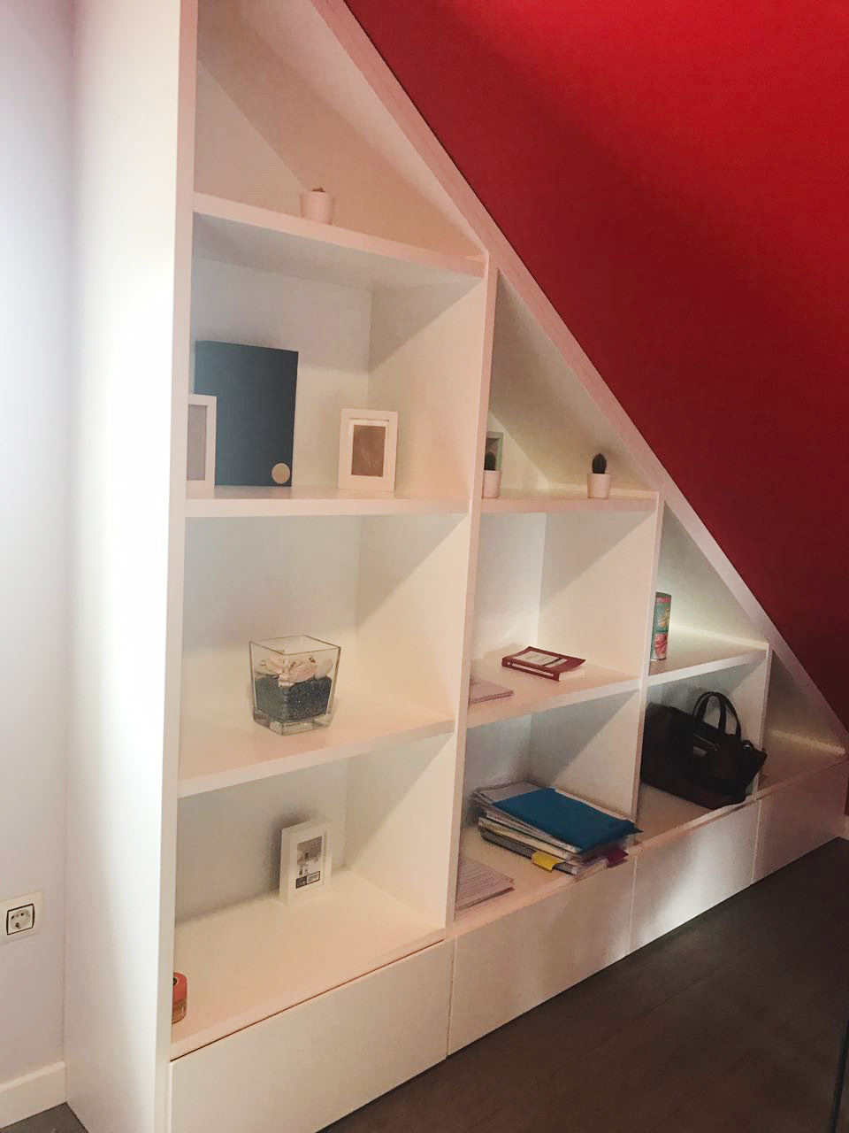 Para esta ocasión, el cliente ha confiado en nosotros para decorar uno de los espacios de su hogar. Se trata de un ático con caída, en el que hemos realizado una estantería a medida, totalmente adaptada al espacio. El estante, de laca blanca, está formado por cajones en su parte inferior y espacios libres en los que poder acomodar elementos de decoración. A juego con esto, se ha realizado la bancada que sostiene la cama, esta vez en blanco sin lacar. ¡Ideal!