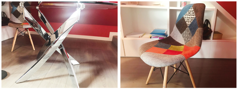 Por último, la habitación se ha completado con la zona de estudio, formada por una mesa con patas de acero y tapa de cristal y una silla que, tapizada con diferentes telas y estampados, crea armonía con el conjunto del cuarto.