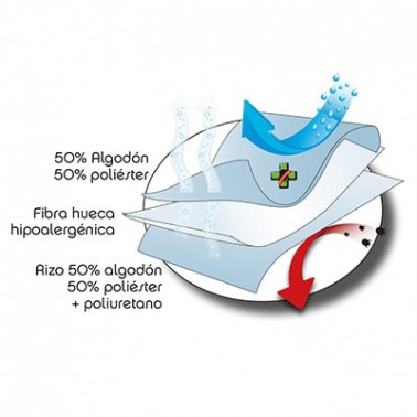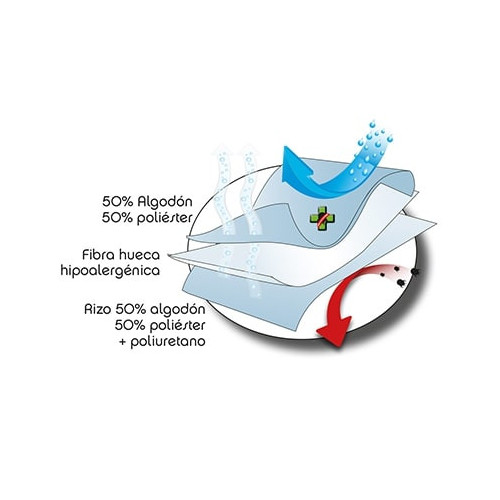 - Tejido superior: 50% Algodón, 50% poliéster con tratamiento Sanitized® antiácaros, antibacterias y antihongos.